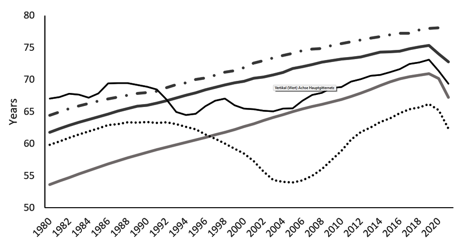 Figure 4: Life Expectancy (years), BRICS countries (1961-2021)