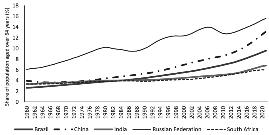 Figure 5: Share of Population Aged 65 and over (%), BRICS countries (1961-2021)