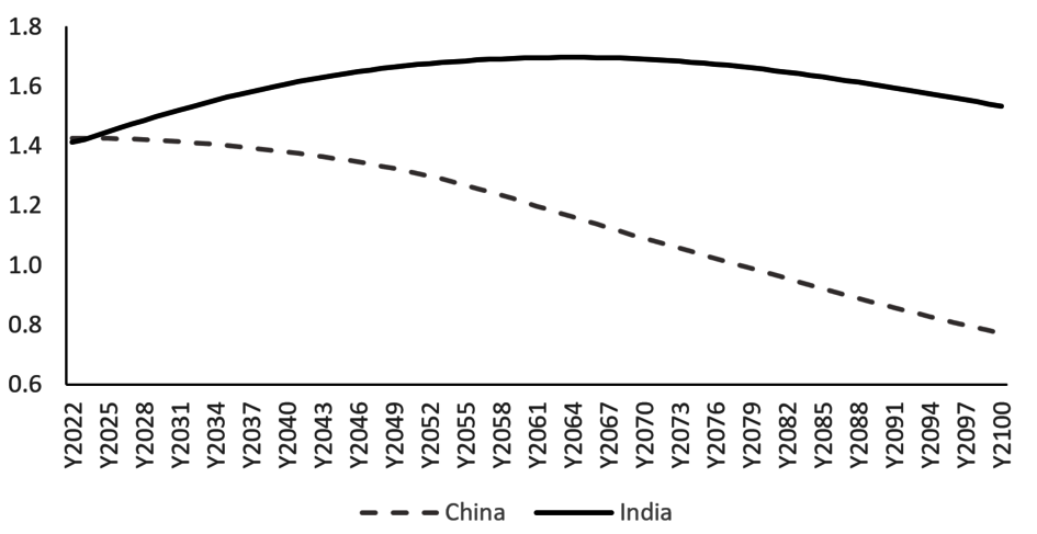 Figure 1: Population forecast (medium estimates), China & India (2022-2100)