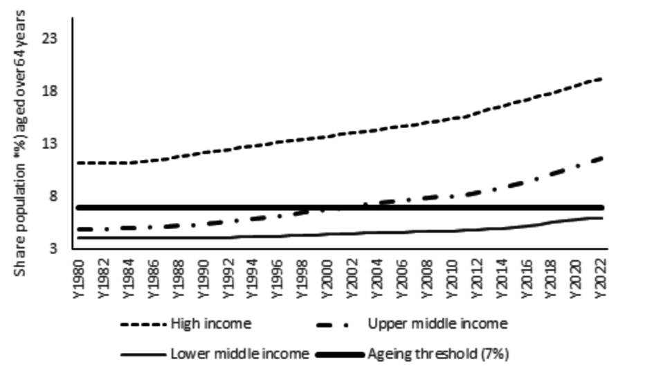 The chronology of China’s uniquely integrated approach to economic and demographic change presented in Table 2 can be summarised as a two-tier approach. The first tier comprises identifying and implementing policies to ensure China captured its low-wage demographic dividend for rapid economic development. The second tier concerned early incremental preparations, both direct and indirect, for the later period of intensive population ageing. That is, when China would be ‘old’ but not yet ‘rich’ and need to cater for large numbers of elderly at the same time as continuing economic development. (12) Johnston (2018 & 2021) outlines in greater details each phase in the unique case of China and also highlights its ageing-related systematic gradualism in policymaking. This is complemented by economic preparedness – readiness for moving into more capital-intensive growth, away from labour-intensive growth at the middle-income phase of development.
