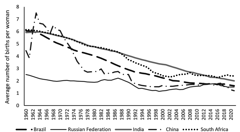 Figure 3: Total Fertility Rate, BRICS countries (1961-2021)