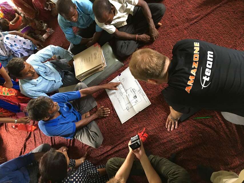 For three years, the Hasbergen-based company has been supporting a local Welthungerhilfe project for sustainable agriculture with donations of EUR 90,000 to date. Their cooperation, however, goes far beyond financial. As an integral component of their education, the young women and men use real case studies to develop ideas for how farming families can farm effectively despite droughts and depleted soil. They drew lots to determine who would go to India. The four trainees are now learning about how worm composting works, how valuable cattle urine is and why manufacturing organic fertiliser saves smallholders immense amounts of money. In the community centre, they crouch with the farmers, talking about what they need.