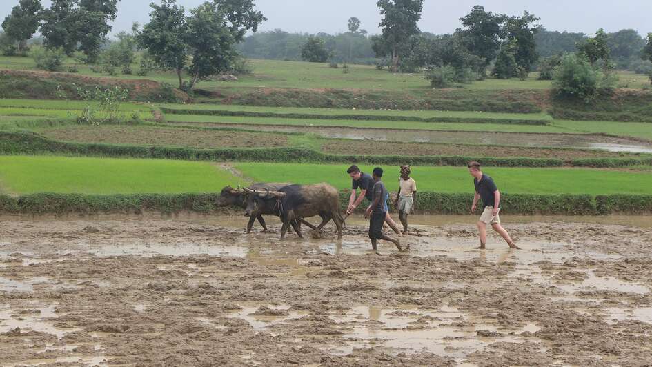 Up to their ankles in mud, Stefan Kemme and Kevin Pelke fight their way through the rice field behind the plough. As soon as the soil is prepared, the seedlings are planted by hand, forcing the planters to spend hours working stooped over. “We prepared intensively for the trip, watching films and reading documents. However, the conditions under which the farmers are really working here were simply unimaginable to us in Germany,” Stefan Kemme tells me. I am travelling to the Indian district of Deoghar with the 23-year-old, three other Amazonen-Werke trainees and Head of Personnel René Hüggelmeier.