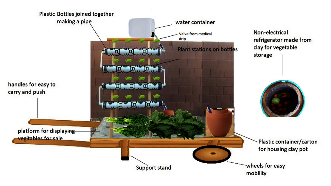 Idea: An affordable, space-saving and portable vertical garden to grow food with integrated non-electrical fridge for refugees looking to grow food for consumption and selling